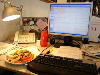 …men ibland finns det ingen annan utväg än att inta lunchen (kycklingfilé, kokta morötter och en massa grönsaker, skivat äpple, avocado och solrosfrön) framför datorn.