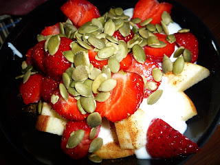 Foto privat. Bästa mellanmålet – färska bär, laktosfri yoghurt, pumpakärnor och kanel.